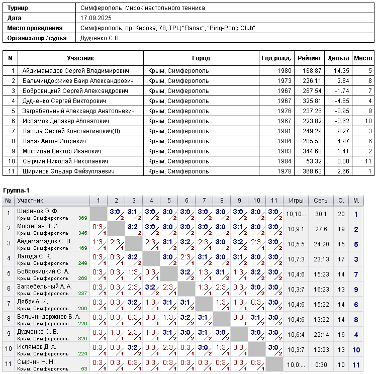 Турнир «Мирок настольного тенниса» (30.04.2025) Участников — 11 чел. Турнир проходил в два этапа. Первый этап — групповой, Второй этап — сетка («двухминусовка») Трансляции некоторых встреч турниров расположены здесь Трансляция этого турнира