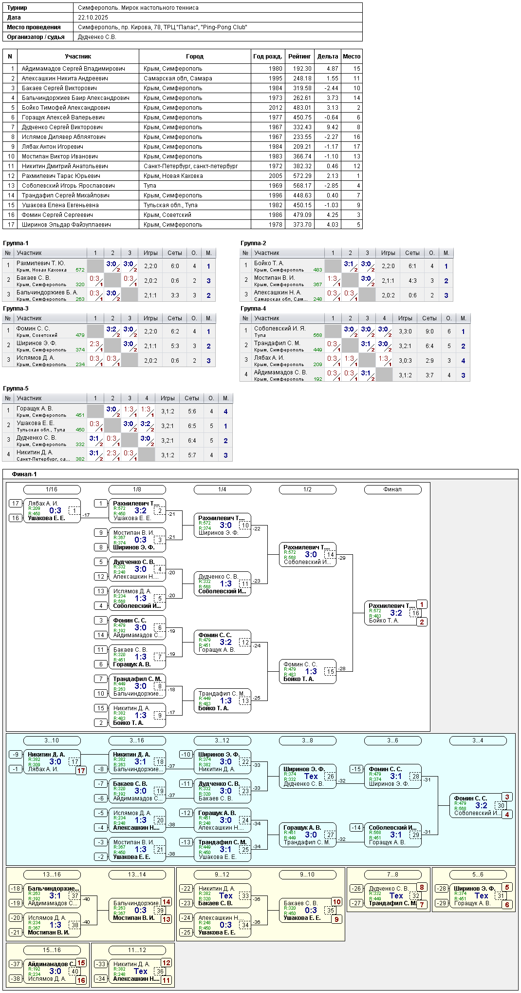 Турнир «Мирок настольного тенниса» (20.08.2025) Участников — 10 чел. Турнир проходил в два этапа Первый этап групповой, второй этап сетка ("двухминусовка"). Трансляции некоторых встреч турниров расположены здесь Трансляция этого турнира