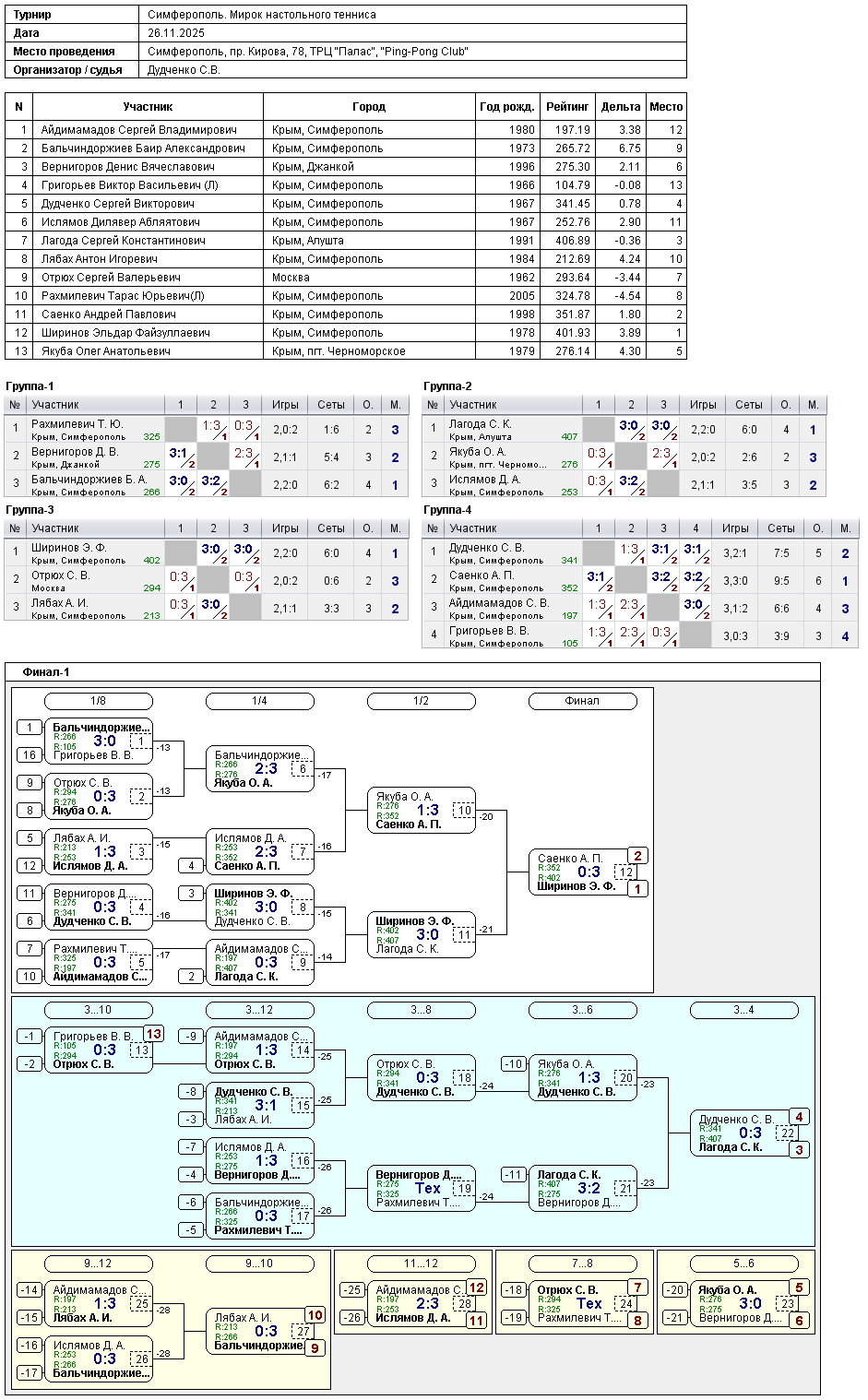Турнир «Мирок настольного тенниса» (30.04.2025) Участников — 11 чел. Турнир проходил в два этапа. Первый этап — групповой, Второй этап — сетка («двухминусовка») Трансляции некоторых встреч турниров расположены здесь Трансляция этого турнира