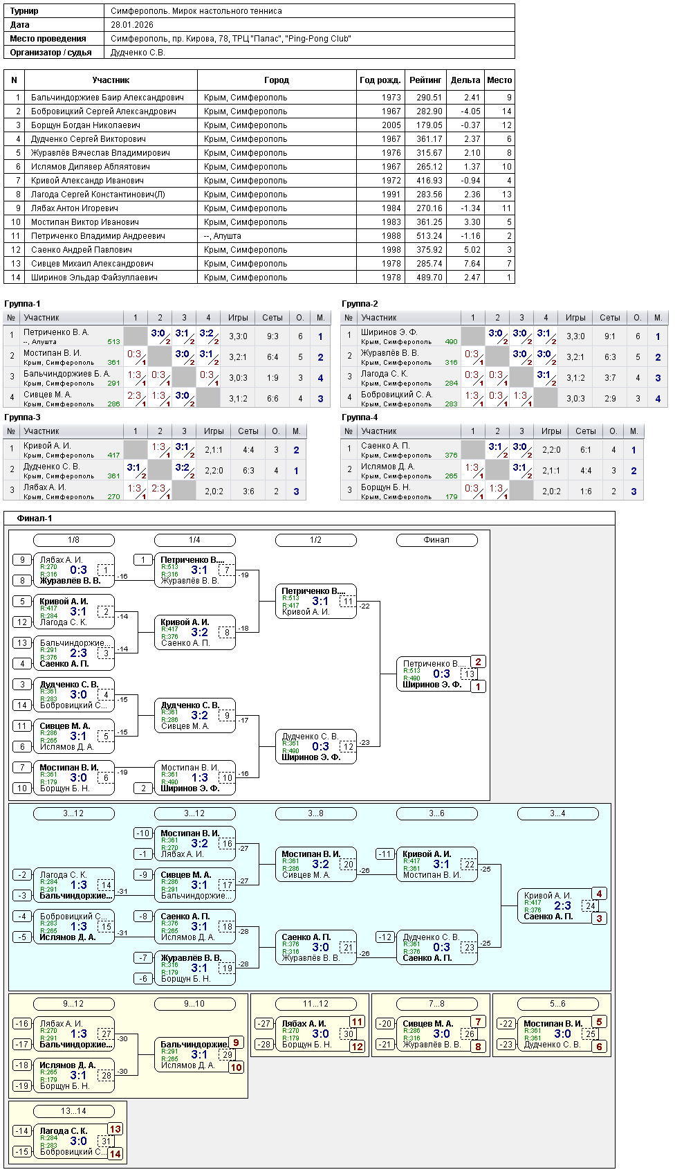 Турнир «Мирок настольного тенниса» (14.01.2026) Участников — 8 чел. Турнир проходил в один этап (по круговой схеме). У данного турнира нет спонсоров, все изображения логотипов спонсоров это антураж с площадки проведения турнира.…