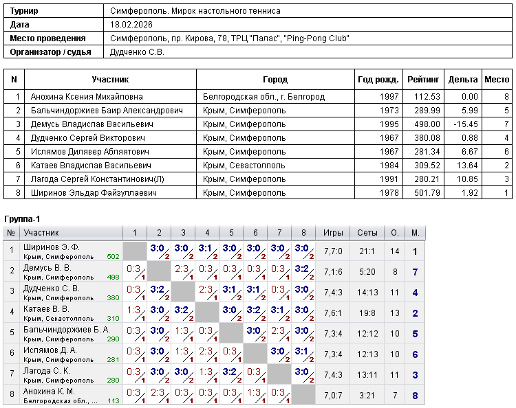 Победители сегодняшнего (18.02.2026) турнира «Мирок настольного тенниса»